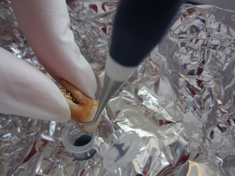 Close up view of sampling dental plague from a human tooth. The plaque is carefully scraped into a solution for demineralization for DNA extraction. See christinawarinner.com for more information.