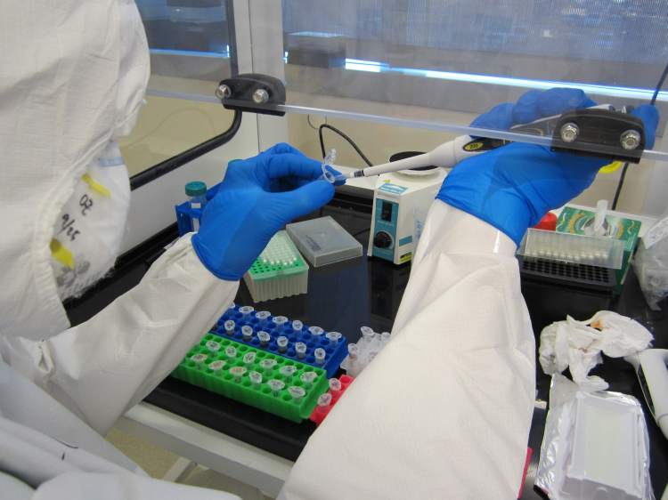 Close up of researcher pipetting samples for ancient DNA extraction. Pipetting samples is also used for Zooarchaeological Mass Spectrometry which allows for identification of different animals from fragmentary samples. christinawarinner.com