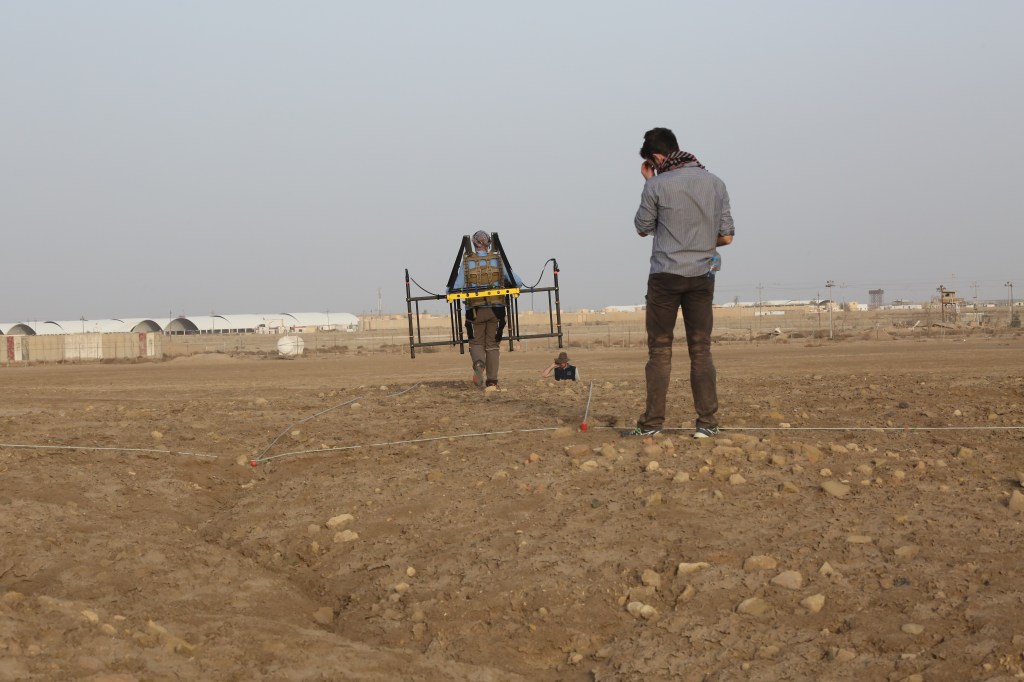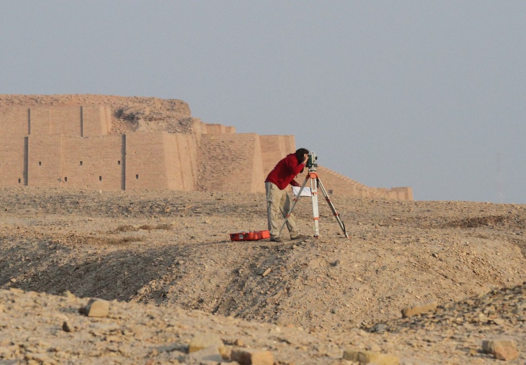 Left to right: 1) Melina Seabrook sieving for collecting bones. 2) Annelies Van de Ven taking GPS points with a total station for situating the excavation on the known world grid. 3) A drone taking off to survey a site from the air, can record the landscape at a large scale including subtle changes in elevation. 4) Geophysical survey to find and understand subterranean features on archaeological sites. 5) Iraqi archaeological student, Karrar, runs the flotation machine to collect small leftover plant remains- the water runs through the various containers taking the sediment, leaving the plant remains in the fabric of the top container.