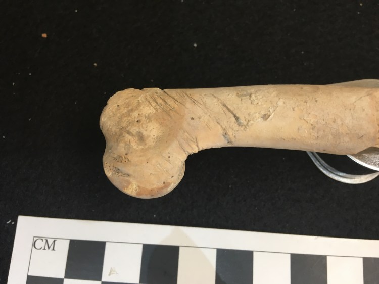 Archaeologists can examine cutmarks on bones to assess different types of butchery patterns. Pictured is a sheep humerus with numerous cuts on the distal end.